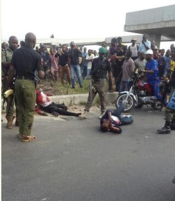 This caused a scene at the Alakija area with passers-by hustling to have a glance at the corpses of the robbers.